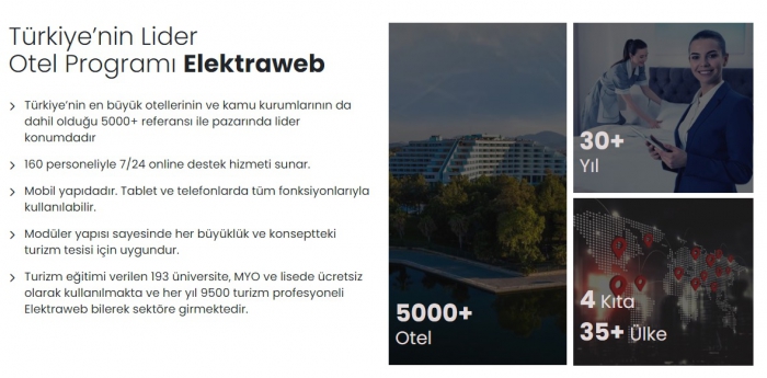 ELEKTRAWEB, 2025 yılı itibariyle 5000’den fazla tesiste aktif olarak kullanılmakta ve Türkiye pazarında liderliğini sürdürmektedir. Yazılım, otellerin ihtiyaçlarına göre özelleştirilebilmekte; 7/24 çağrı destek hizmeti ile maksimum verimlilik ve kesintisiz operasyon olanağı sunmaktadır.