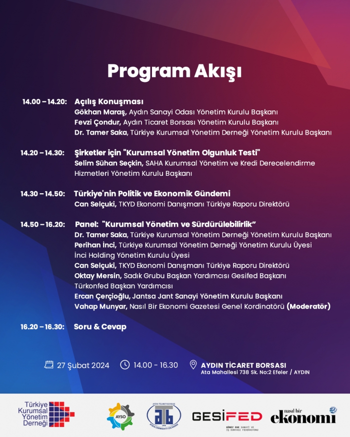 Aydın Ticaret Borsası’nda yapılacak panelin moderatörlüğünü Nasıl Bir Ekonomi Gazetesi Genel Koordinatörü ve Köşe Yazarı Vahap Munyar yaparken, açılış konuşmalarını ise TKYD Yönetim Kurulu Başkanı Dr. Tamer Saka, Aydın Sanayi Odası Yönetim Kurulu Başkanı Gökhan Maraş ve Aydın Ticaret Borsası Yönetim Kurulu Başkanı Fevzi Çondur gerçekleştirecek. Panelde ise; TKYD Yönetim Kurulu Başkanı Dr. Tamer Saka, Türkiye Kurumsal Yönetim Derneği Yönetim Kurulu Üyesi ve İnci Holding Yönetim Kurulu Üyesi Perihan İnci, Türkiye Raporu Direktörü ve TKYD Ekonomi Danışmanı Can Selçuki, Sadık Grubu Yönetim Kurulu Başkan Yardımcısı, Gesifed Yönetim Kurulu Başkanı, Türkonfed Yönetim Kurulu Başkanı Yardımcısı Oktay Mersin ve Jantsa Jant Sanayi ve Ticaret A.Ş. Yönetim Kurulu Başkanı Ercan Çercioğlu yer alacak.