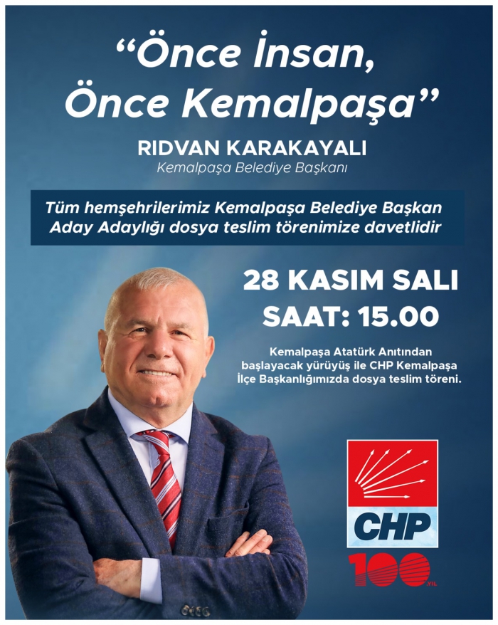 Kemalpaşa Belediye Başkanı Rıdvan Karakayalı, 31 Mart 2024 tarihinde gerçekleştirilecek olan yerel seçimlerde Kemalpaşa Belediye Başkanlığı adaylık dosyasını yarın teslim edecek.