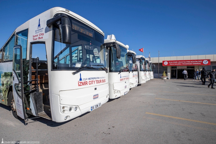 Üstü açık tur otobüsleri tahsis edildi Limandaki gümrük alanı İzmir Vakfı tarafından oluşturulan ve İzmir kent kimliğini yansıtan İzmir görselleriyle yenilendi. Turistlerin “Visit İzmir” uygulamasıyla şehri keşfetmeleri için düzenlenen görseller liman içine ve liman çıkışına yerleştirildi. Gümrük alanında yer alan Turizm Bilgilendirme Ofisi’nde turistlere Turizm Şube Müdürlüğü’nün uzman personelleri tarafından yönlendirmeler ve tarihi kent merkezi hakkında bilgilendirmeler yapılıyor, broşürler dağıtılıyor. İzmir Büyükşehir Belediyesi, üstü açık tur otobüslerini de turistler için tahsis etti. Turistler, nostaljik tramvay ile Kordon gezisine erişme imkanına da sahip. Ayrıca Turizm Zabıtası ekipleri ile turistlerin güven içinde kentte seyahat imkanları arttırıldı.