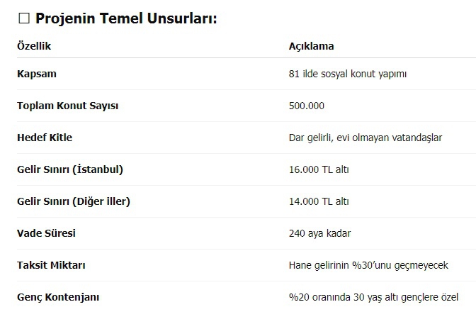 Kurum ayrıca, 30 yaş altı gençler için yaklaşık yüzde 20 kontenjan ayrılacağını ve yaş aralıklarına göre bir oranlama yapılacağını da belirtti. "Yeni evliler" ifadesiyle gençlerin kastedildiğini belirten Bakan, projeye giremeyenlerin arsa başvurusu yaparak kendi evlerini inşa etme şansına sahip olacaklarını dile getirdi.