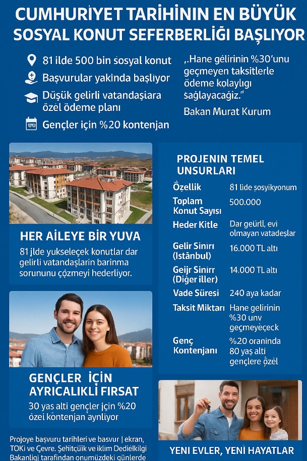 Çevre, Şehircilik ve İklim Değişikliği Bakanı Murat Kurum, Cumhurbaşkanı Recep Tayyip Erdoğan başkanlığında yapılan son Kabine Toplantısı'nın ardından sosyal konut projelerine dair önemli açıklamalarda bulundu. Bakan Kurum, 81 ilde hayata geçirilecek 500 bin konutluk sosyal konut hamlesiyle dar gelirli vatandaşlara konut sahibi olma imkânı sunulacağını belirtti.