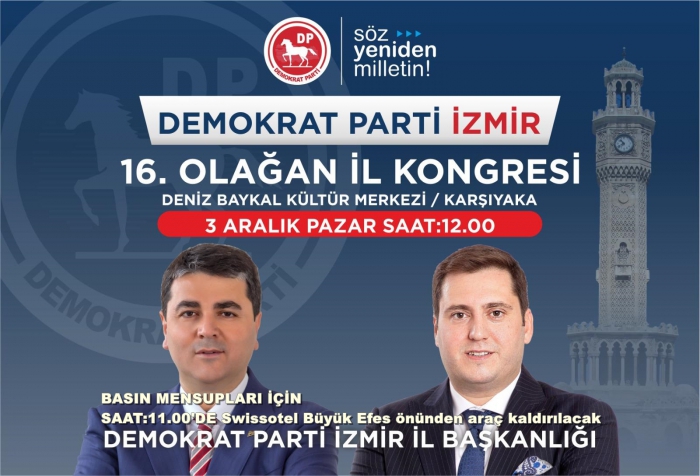 Demokrat Parti’nin (DP) kalbi hafta sonunda İzmir’de atacak. hafta sonunda DP İzmir 16. İl Kongresi 3 Aralık 2023 Pazar günü şölen havasında gerçekleşecek. Karşıyaka’daki Deniz Baykal Kültür Merkezi’ndeki kongrenin başlama saati 12.00.
