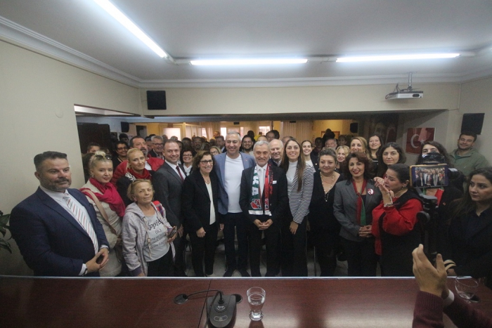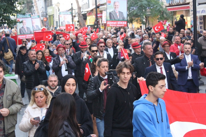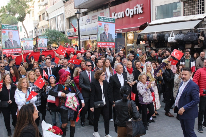 Ahmet Diker’in adaylık açıklaması bir mitinge dönüştü. Karşıyaka İZBAN istasyonunda bir araya gelen yüzlerce Karşıyakalı ile buluşan Diker, Karşıyakalıların ellerinde taşıdıkları Atatürk posteri, Türk Bayrağı ve Diker’in posterleri eşliğinde Kaf Sin Kaf sloganlar eşliğinde CHP Karşıyaka İlçe Binasına kadar yürüdü. Diker, İlçe Binası önünde Karşıyakalıların isteği üzerini zeybek oynarken, izleyenler yoğun tezahüratta bulundu… CHP Karşıyaka İlçe Başkanlığında Diker’i ve Karşıyakalılar İlçe Başkanı Levent Güçlü ve partililer karşıladı. Konferans salonunda partililere konuşan Ahmet Diker; “Cumhuriyet Halk Partisi 2000’li yıllarda baraj altında kalmış bir partiydi. O dönem DSP rüzgârı esiyordu, baraj altında kalmış CHP’nin partinin il yönetim kurulu üyesiydim. Herkes o zamanlar Cumhuriyet Halk Partisi’nden uzaklaşırken bizler partiyi ayağa kaldırmak için gecemizi gündüzümüze kattık.”