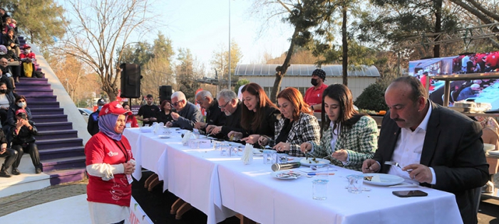 ADÜ Didim Meslek Yüksekokulu Aşçılık Programı öğrencileri de söyleşi devam ederken Mutfak Atölyesi çalışmalarında birbirinden lezzetli enginar yemekleri yaptı. Öğretim Görevlisi Mehmet Taş, söyleşinin sonunda Efeler Belediye Başkanı Mehmet Fatih Atay ile birlikte yanan ocağın başına geçti. “Yemeklerde benim de katkım bulunsun” diyen Başkan Atay’ın, değirmen çekerek tuz döktüğü anlar renkli görüntüler oluşturdu. Hazırlanan tabakların tadına da bakan Efeler Belediye Başkanı Atay’ın “Ben enginarı çocukluğumdan beri çok severim. Annemden özellikle yapmasını istediğim yemeklerdendi. Belediye Başkanı olunca da Efeler enginarının tanınması ve değer görmesi için fabrikasını kurdum” sözleri izleyicilerden büyük alkış aldı.