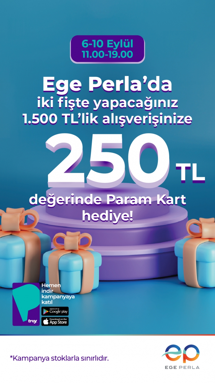 İzmir’in Hoş Vakit Merkezi Ege Perla, 6-10 Eylül tarihleri arasında, iki fişteyapacağınız 1.500 TL ve üzeri alışverişlerde geçerli 250 TL yüklü Param Kart hediye ediyor. Stoklarlasınırlı bu kampanyadanyararlanmak için; 11.00-19.00 saatleri arasında, Ege Perla mobiluygulamasınıindirerekkampanyanoktasınagelenziyaretçiler, kazanacakları Param kartlarıEge Perla mağazalarında kullanabilecekler. Kampanyalar, etkinlikler ve yepyeni mağazalar hakkında detaylı bilgiler; Ege Perla web sitesi, mobil uygulama, kampanya noktası ve sosyal medya hesaplarında.