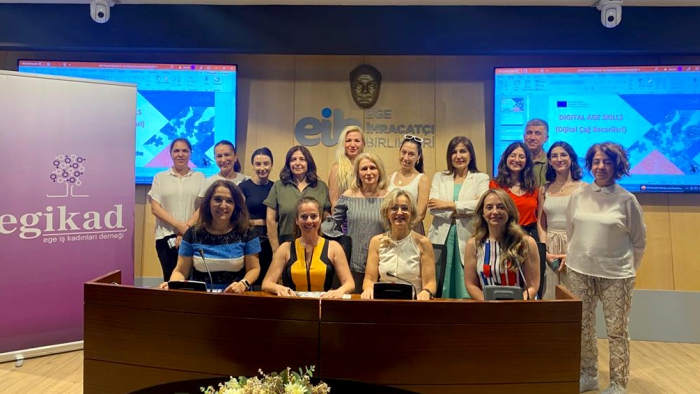 Ege İş Kadınları Derneği’nin (EGİKAD) koordinatörlüğünü üstlendiği ‘Dijital Çağ Becerileri’ (DAS) Erasmus Projesi yapılan toplantı ve organizasyonlarla devam ediyor. Covid-19 sonrası işlerini bırakmak zorunda kalan düşük mesleki vasıflı kadınların dijital becerilerini geliştirebilmelerine yardımcı olma hedefiyle hayata geçirilen Avrupa Birliği onaylı DAS Projesi’nin çoğaltıcı etkinliği Ege İhracatçı Birlikleri (EİB) Toplantı Salonu’nda yapıldı.