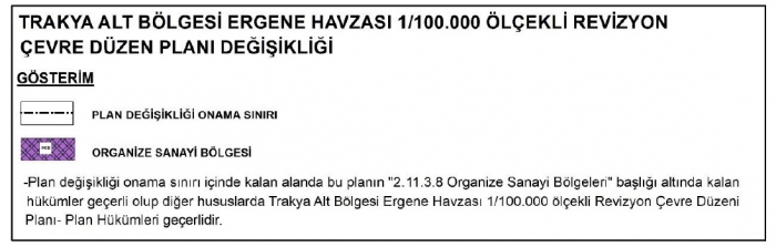 2. TRAKYA ALT BÖLGESİ ERGENE HAVZASI 1/100.000 ÖLÇEKLİ REVİZYON ÇEVRE DÜZENİ PLANI DEĞİŞİKLİĞİ: 14.06.2014 tarih ve 29030 sayılı Resmi Gazete’de yayımlanarak yürürlüğe giren Mekânsal Planlar Yapım Yönetmeliği ile 1/100.000 ölçekli Revizyon ÇDP ve iletilen görüşler doğrultusunda yapılan değerlendirmeler neticesinde; Organize Sanayi Bölgeleri yer seçiminin 4562 sayılı “Organize Sanayi Bölgeleri Kanunu” ve ilgili yönetmelikleri uyarınca yapılmakta olduğu göz önünde tutularak, Ergene 2 OSB ve İlave Alanına ilişkin Yer Seçimi Komisyonlarınca uygun görülen yaklaşık 750 hektar büyüklüğündeki alanın, 1/100.000 ölçekli Revizyon ÇDP’nin F-19 nolu plan paftasında (Plan değişikliği onama sınırı içerisinde kalan kısım) “Organize Sanayi Bölgesi (OSB)” olarak gösterilmesine yönelik düzenleme yapılmıştır.