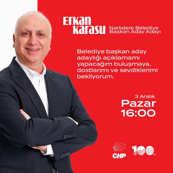 Yirmi yıl boyunca görev yaptığı Narlıdere Belediyesi’nde önemli hizmetleriyle iz bırakan başkan yardımcılığı görevini de başarıyla yürüten Erkan Karasu, Narlıdere Cumhuriyet Halk Partisi (CHP) ilçe örgütü binasında başvuru dosyasını verecek, Belediye Başkan Aday Adaylığını açıklayacak.