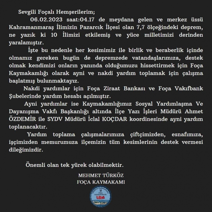 Foça Kaymakamı Mehmet Türköz yayınladığı bir bildiriyle yardım kampanyası için çağrı yaptı. Türköz çağrısında " Sevgili Foçalı Hemşerilerim 06.02.2023 saat 04.17 de meydana gelen merkez üssü Kahramanmaraş ilimizin Pazarcık İlçesi olan 7.7 ölçeğindeki deprem ne yazıkki 10 ilimizi etkilemiş ve yüce milletimizi derinden yaralamıştır.