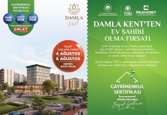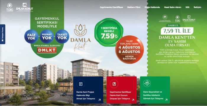 İstanbul Başakşehir'de, TOKİ ile iş birliği içerisinde hayata geçirilen Damla Kent Projesi, gayrimenkul sertifikalarının yatırımcılarla buluşturulduğu önemli bir örnek olma yolunda ilerliyor. Proje, 5.325 konut ve 244 ticari üniteyi kapsayacak şekilde planlanmış olup, İstanbul'un hızla gelişen ve talep gören bölgelerinden birinde inşa edilecek.