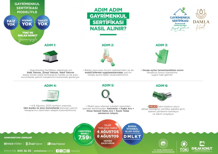 Soru: Gayrimenkul sertifikası nedir? Cevap: Gayrimenkul sertifikaları, inşa edilecek veya edilmekte olan projelere finansman sağlamak amacıyla ihraç edilen, SPK denetiminde bir menkul kıymettir. Soru: Gayrimenkul sertifikalarının avantajları nelerdir? Cevap: Küçük birikimlerle büyük projelere yatırım yapma, değer artışından kazanç sağlama veya konut sahibi olma fırsatları sunar. Soru: Gayrimenkul sertifikaları kimler tarafından denetlenir? Cevap: Sermaye Piyasası Kurulu (SPK) tarafından denetlenir. Soru: Gayrimenkul sertifikaları borsada işlem görebilir mi? Cevap: Evet, gayrimenkul sertifikaları Borsa İstanbul’da işlem görür. Soru: Damla Kent Projesi nedir? Cevap: İstanbul Başakşehir’de TOKİ ile iş birliğiyle geliştirilmekte olan 325 konut ve 244 ticari ünite içeren büyük bir projedir. Soru: Damla Kent Projesi ne zaman başladı? Cevap: Damla Kent Projesi için sertifika ihracı başvurusu 23 Temmuz 2025’te SPK tarafından onaylanmıştır. Soru: Proje kapsamında kaç konut inşa edilecek? Cevap: Proje kapsamında toplam 5.325 konut inşa edilecektir. Soru: Proje içerisinde kaç ticari ünite olacak? Cevap: 244 ticari ünite yer alacaktır. Soru: Damla Kent Projesi için belirlenen sertifika fiyatı nedir? Cevap: Birim fiyatı 7,59 TL olarak belirlenmiştir. Soru: İlk etapta kaç konutun finansmanı sağlanacak? Cevap: İlk etapta 1.540 konutun finansmanı sağlanacaktır. Soru: İkinci etapta kaç konutun finansmanı sağlanacak? Cevap: Ek satışla birlikte toplam 2.214 konutun finansmanı sağlanacaktır. Soru: A Etabı için kaç sertifika ihraç edilecek? Cevap: 1.923.481.773 adet sertifika ihraç edilecektir. Soru: A+B Etabı için kaç sertifika ihraç edilecek? Cevap: 2.820.593.495 adet sertifika ihraç edilecektir. Soru: Proje ne zaman borsada işlem görmeye başlayacak? Cevap: 14 Ağustos 2025 tarihinde borsada işlem görmeye başlanacaktır. Soru: Proje başlangıç tarihi nedir? Cevap: Projenin başlangıç tarihi 12 Şubat 2026’dır. Soru: Asli edim kullanım süresi başlangıcı ne zaman olacak? Cevap: Asli edim kullanım süresi 11 Ağustos 2028’de başlayacaktır. Soru: Asli edim kullanım süresi ne zaman sona erecek? Cevap: 14 Ağustos 2028’de sona erecektir. Soru: Tali edim ifa süresi ne zaman başlayacak? Cevap: Tali edim ifa süresi 14 Ağustos 2028’de başlayacaktır. Soru: Gayrimenkul sertifikası almak için hangi adımlar izlenmelidir? Cevap: Yatırımcı önce banka hesabına giriş yapmalı, yatırım hesabı açmalı ve ardından sertifikayı almalıdır. Soru: Gayrimenkul sertifikası nasıl alınır? Cevap: Yatırımcılar, aracı kurumlar ve bankalar aracılığıyla Borsa İstanbul'da işlem saatleri içinde sertifika alabilirler. Soru: Gayrimenkul sertifikası almak için minimum birikim gerekir mi? Cevap: Gayrimenkul sertifikaları küçük birikimlerle alınabilir, yani yatırımcılar küçük meblağlarla da yatırım yapabilir. Soru: Sertifika satın alındıktan sonra ne yapılabilir? Cevap: Sertifikalar biriktirilebilir veya Borsa İstanbul’da alım-satım yaparak değer artışından kazanç sağlanabilir. Soru: Gayrimenkul sertifikası alırken hangi hesap gereklidir? Cevap: Yatırımcı, bir yatırım hesabı açmalı ve yatırımlarını bu hesap üzerinden gerçekleştirmelidir. Soru: Sertifikalar hangi piyasalarda işlem görür? Cevap: Gayrimenkul sertifikaları Borsa İstanbul'da işlem görür. Soru: Gayrimenkul sertifikalarının vadesi nedir? Cevap: Sertifikaların vadesi, proje süresi boyunca devam eder ve yatırımcılar vade sonunda veya arada istedikleri zaman işlem yapabilirler. Soru: Sertifika alım satım işlemi nasıl yapılır? Cevap: Sertifikalar, Borsa İstanbul'da işlem saatleri içinde, yatırımcıların güncel piyasa fiyatlarından alım-satım yapmasına olanak tanır. Soru: Sertifikaların nakit karşılığı nasıl alınır? Cevap: Yatırımcılar, vade sonunda sertifikalarını nakit karşılığında satabilirler. Soru: Projeye yatırım yaparak ne gibi kazançlar sağlanabilir? Cevap: Proje değer artışından kazanç sağlanabilir ya da konut sahibi olma imkânı elde edilebilir. Soru: Sertifikaların işlem görmeye başlaması ile ne olur? Cevap: Sertifikalar, yatırımcılar için likit bir yatırım aracına dönüşür ve yatırımcılar alım-satım yaparak kazanç sağlayabilirler. Soru: Sertifika alırken nelere dikkat edilmelidir? Cevap: Yatırımcı, sertifika fiyatlarını ve piyasa koşullarını dikkatlice takip etmelidir. Soru: Damla Kent Projesi'nin finansmanı nasıl sağlanıyor? Cevap: Projenin finansmanı, gayrimenkul sertifikaları ile sağlanmaktadır. Soru: Damla Kent Projesi'nin maliyeti nedir? Cevap: Proje toplamda 21.408.304.627,05 TL’lik bir değere sahiptir. Soru: Proje etabının ilk halka arzı ne zaman gerçekleşecek? Cevap: Halka arz takvimi, izahname setinin yayımlanmasından sonra kamuoyuyla paylaşılacaktır. Soru: Damla Kent Projesi'nin ne gibi özellikleri var? Cevap: Proje, geniş bir konut ve ticari alan karışımına sahip olup, İstanbul Başakşehir'de yer alacaktır. Soru: Gayrimenkul sertifikası almak için hangi tür bir yatırımcı olmalıyım? Cevap: Herhangi bir yatırımcı, banka veya aracı kurum üzerinden gayrimenkul sertifikası alabilir. Soru: Sertifikaların işlem görmesi ile yatırımcı nasıl kazanç sağlar? Cevap: Sertifikalar borsada işlem gördüğü için, yatırımcılar alım-satım yaparak değer artışından kazanç sağlayabilir. Soru: Gayrimenkul sertifikalarının yatırımcıya sağladığı en önemli avantaj nedir? Cevap: Küçük yatırımcıların büyük projelere katılmasına ve borsada işlem görerek likidite sağlamasına olanak tanır. Soru: Damla Kent Projesi'nde konutlar hangi ödeme planına göre satılacak? Cevap: Sertifikalar aracılığıyla, konutlar alınıp satılabilir ve ödeme planları bu sertifikalara göre yapılacaktır. Soru: Ser