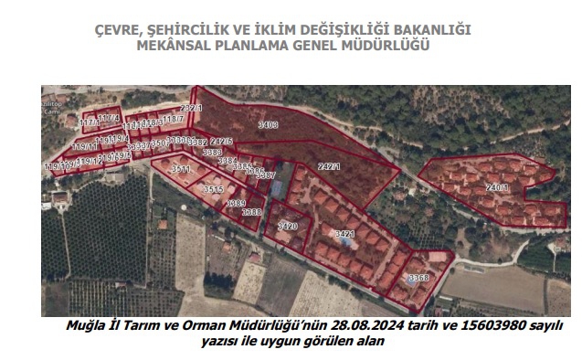 Muğla İl Tarım ve Orman Müdürlüğü, 28.08.2024 tarihli yazısında tarım dışı kullanım için olumlu görüş verdi. DSİ 21. Bölge Müdürlüğü, alanın içme suyu, sulama sahası veya dere yatağı ile ilişkili olmadığını bildirdi. Muğla Çevre, Şehircilik ve İklim Değişikliği İl Müdürlüğü, alanın doğal sit, özel çevre koruma ya da sulak alan sınırları dışında olduğunu vurguladı. Muğla Orman Bölge Müdürlüğü, alanın orman sınırları dışında olduğunu ve orman vasfı taşımadığını açıkladı. Doğa Koruma ve Milli Parklar Genel Müdürlüğü, söz konusu arazide koruma statüsüne sahip bir alan bulunmadığını belirtti. Maden ve Petrol İşleri Genel Müdürlüğü, alanın maden ruhsatı bulunmamakla birlikte bir jeotermal kaynak değerlendirme sahasıyla girişimli olduğunu bildirdi. Kültür Varlıklarını Koruma Kurulu, bir parselde tespit edilen tonozlu mezar yapısına koruma şerhi koydu.Mevcut İmar Planları ve Hukuki Dayanaklar