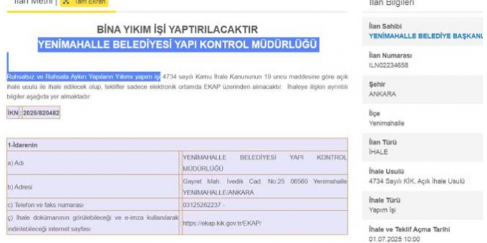 Yenimahalle Belediyesi Yıkım İhalesine Çıkıyor: 4260 Kaçak Yapı 180 Gün İçinde Yıkılacak