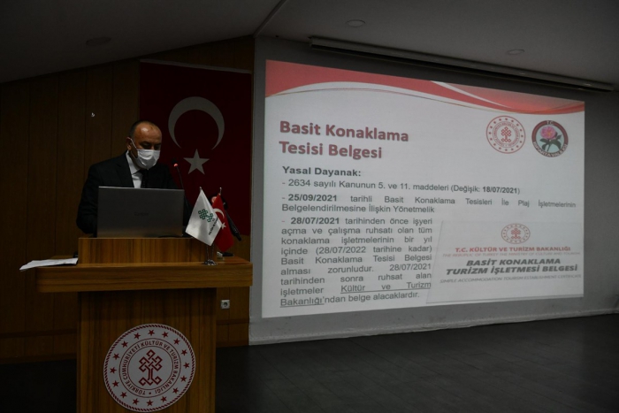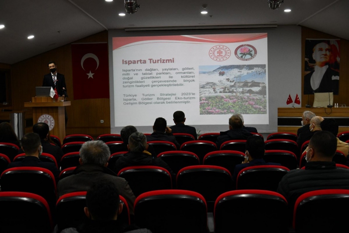 Toplantı, Kültür ve Turizm Müdürlüğü’nün Isparta’daki mevcut turizm hareketliliğini ve potansiyeli değerlendiren bir sunumuyla başladı. Toplantıda ayrıca 28 Temmuz 2021 tarihinden önce iş yeri açma ve çalışma ruhsatı olan tüm konaklama işletmeleri için Bakanlıkça zorunlu kılınan Basit Konaklama Turizm İşletme Belgesi edinilmesi hakkında da otel işletmecilerine sunum yapıldı.