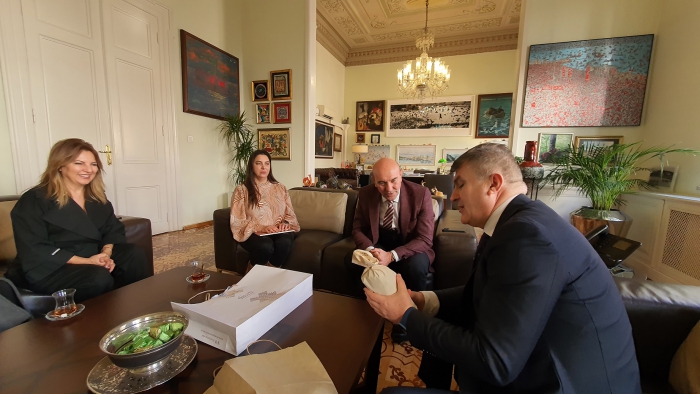 Kındap, Başkan Soyer’e Alaşehir’deki jeotermal enerji sahalarında üretilip hasatları yapılan, Alaşehir Kadın Girişimi Üretim ve İşletme Kooperatifi üyesi kadınlar tarafından kurutulan ve özenle, ambalajlanan kuru üzümlerden ikram etti. JED heyetinin İzmir Büyükşehir Belediyesi’ni ziyaretinde İZENERJİ Yönetim Kurulu Başkanı Ercan Türkoğlu, İZFAŞ Genel Müdürü Canan Karaosmanoğlu ve İzmir Büyükşehir Belediyesi Eğitim Koordinatörü Aytekin Sözen de yer aldı.