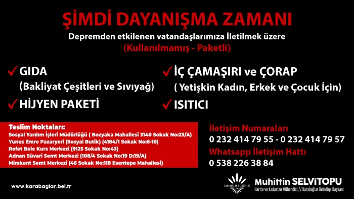 Kibar Belediye Hizmet Kompleksi'ndeki koordinasyon merkezi ve ilçenin 5 farklı noktasında, ihtiyaç sahipleri için kuru gıda, ısıtıcı, hijyen paketi gibi destekler toplanıyor. Vatandaşlarımızdan özellikle bugünlerde bakliyat çeşitleri ve sıvı yağ, iç çamaşırı, kadın pedi, çocuk bezi gibi ürünleri, depremzede vatandaşlarımıza ulaştırılmak üzere teslim noktalarına getirmeleri isteniyor. Bu desteklerin afet bölgeleriyle irtibatlı şekilde nakliyesi ve düzen içinde dağıtımı yapılıyor. Karabağlar Belediyesi aynı şekilde bölgenin ihtiyaç duyduğu tonlarca odun ve kömürü tedarik ederek deprem bölgesine ulaştırıyor.