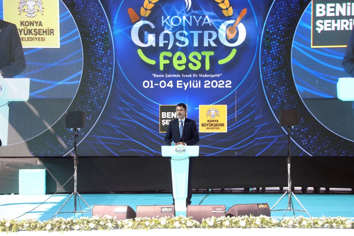 Çevre Şehircilik ve İklim Değişikliği Bakanı Murat Kurum, GastroFest ile Konya’da yüzlerce yıllık bir birikimin gastronomi meraklıları ile buluşacağını belirterek, “Konya mutfağı için ‘Yiyen hayran, yemeyen pişman!’ derler. Konya Mutfağı; Çatalhöyük’te doğan medeniyetlerle başlayan, Selçuklu saraylarında gelişen ve Mevlevî adap ve erkânıyla yoğrulan muhteşem bir birikimdir. Dünyada tek anıt mezarı olan, Mevlevî dergâhının baş aşçısı Ateşbâzı Veli, Konya mutfağımızın, çok önemli tarihi bir ismidir. Saygıdeğer Hanımefendi’nin ‘Asırlık Tariflerle Türk Mutfağı’ kitabında ‘Türk Mutfağı, asırlardan beri ocaktan tüten bir bilgelik birikimidir’ cümlesi geçer. Aslında bu anlatım, Konya mutfağını tarif eder. Çünkü yıllara sari olan gelenek, sönmeyen ocaklar, büyük birikim, kadim bilgelik denilince akla; şehrimizin zamanları ve çağları aşan, tarifsiz lezzetleri gelir. Hz. Mevlana’nın cömertliği, Ahiliğin ikram ve paylaşma kültürü, şehrimizin gastronomisinin özetidir.” Şeklinde konuştu.