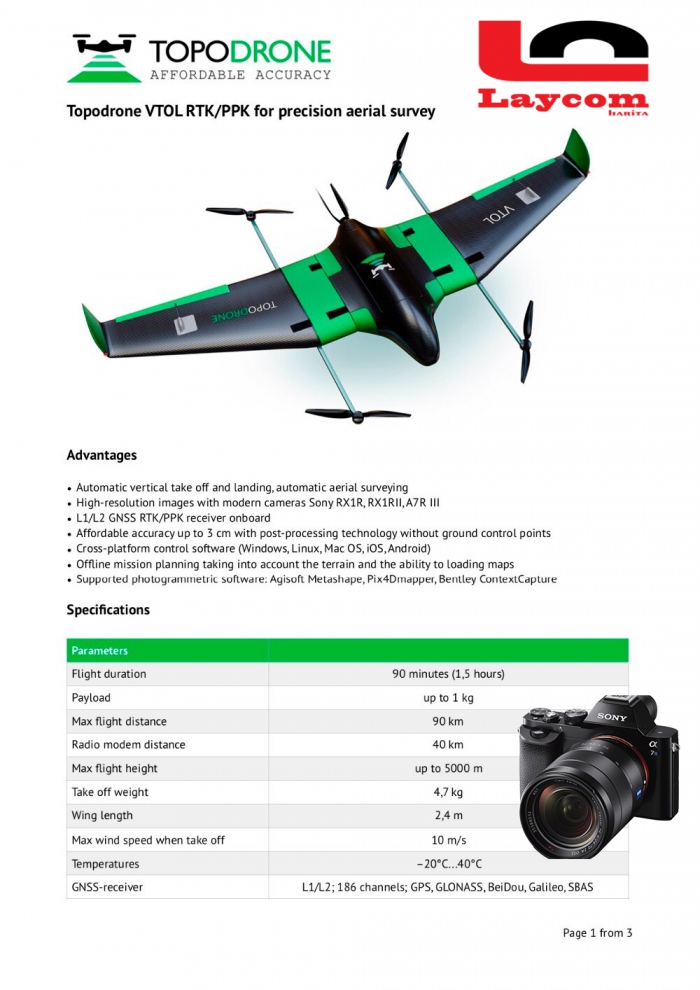 Jeodezik uçak TOPODRONE, geniş alanlar üzerinde yüksek hassasiyetli jeodezik hava fotoğrafçılığı yapmak için tasarlanmıştır. Tüm uçaklar, kontrol noktaları kullanmadan plan ve yükseklikte 2-3 cm hassasiyetle jeodezik hava fotoğrafçılığı yapılmasına olanak tanıyan yerleşik IMU'lu TOPODRONE PPK yerleşik multisystem L1 / L2 GNSS alıcıları ile donatılmıştır. Fotogrametrik işleme yazılımı. Ekipmanımız, Pix4Dmapper, Pix4Dcloud ve tüm Pix4D ürün serisi, Agisoft Metashape, Bentley Context Capture, LIDAR360 ve diğerleri gibi herhangi bir modern fotogrametrik ürünü destekler.