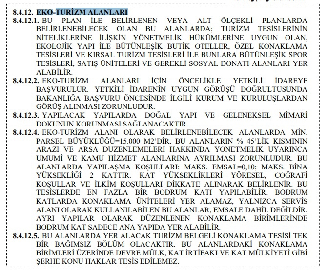 “8.4.12. EKO TURİZM ALANLARI 8.4.12.1. BU PLAN İLE BELİRLENEN VEYA ALT ÖLÇEKLİ PLANLARDA BELİRLENEBİLECEK OLAN BU ALANLARDA; TURİZM TESİSLERİNİN NİTELİKLERİNE İLİŞKİN YÖNETMELİK HÜKÜMLERİNE UYGUN OLAN, EKOLOJİK YAPI İLE BÜTÜNLEŞİK BUTİK OTELLER, ÖZEL KONAKLAMA TESİSLERİ VE KIRSAL TURİZM TESİSLERİ İLE BUNLARA BÜTÜNLEŞİK SPOR TESİSLERİ, SATIŞ ÜNİTELERİ VE GEREKLİ SOSYAL DONATI ALANLARI YER ALABİLİR.