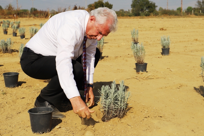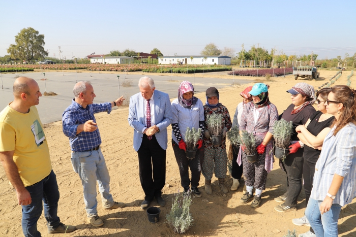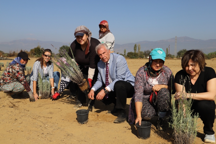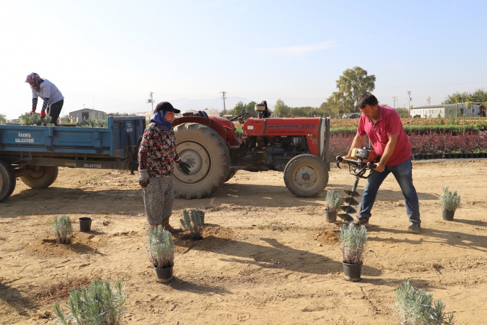 YAĞ ÜRETİMİ İÇİN TESİS KURULACAK Tıbbi-Aromatik Bitkiler Bahçesi bünyesinde uçucu ve sabit yağ üretimi için distilasyon ve sabit yağ tesisi de kurulacak. Bu tesis aynı zamanda Ödemiş ve çevre ilçelerdeki üreticilere de hizmet verecek. Üreticiler tarafından üretimi yapılan ya da doğadan toplanan tıbbi ve aromatik bitkiler bu tesiste işlenerek üreticilerin, bitkilerden piyasa değeri yüksek ürünler elde etmesi sağlanacak. Ödemiş tarımı için alternatif üretim modelleri oluşturma hedefiyle faaliyet gösterecek olan Tıbbi-Aromatik Bitki Bahçesi’nin bahar aylarında halkın ziyaretine açılması planlanıyor. Ödemiş Belediye Başkanı Mehmet Eriş, Belediye Başkan Yardımcısı Bihter Aka ve Park ve Bahçeler Müdürü Seher Gözlü ile birlikte Otamış Üretim Fidanlığı’nda incelemelerde bulunarak ilk lavanta fidelerini toprakla buluşturdu.
