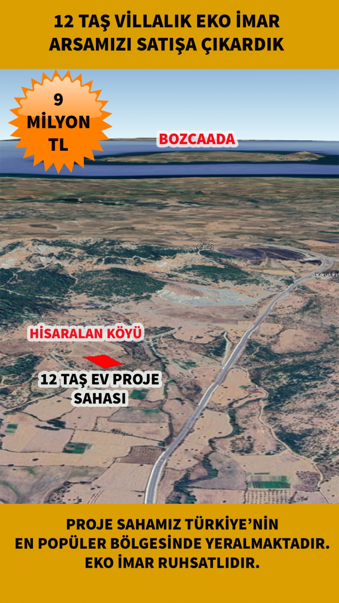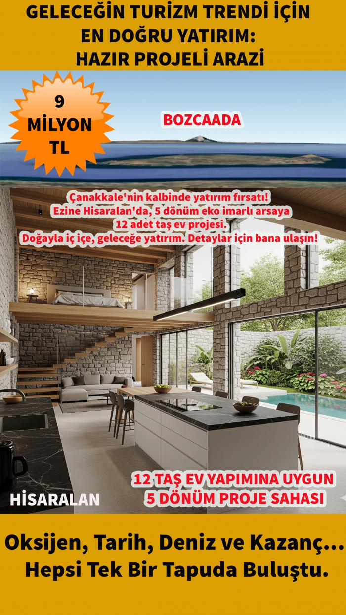 Ezine'nin oksijen deposu Hisaralan köyünde yer alan, 5.000 m² genişliğindeki eko-turizm imarlı bu değerli arazi, 12 adet bağımsız taş ev (villa) yapımına uygun, geliştirilmeye hazır bir projedir.