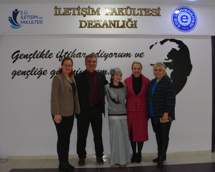 İZMİR (Ege Ajans)- Silikon Vadisi PaloAlto’dan Serbest Araştırmacı Dr. Jaynie Aydın, Egeli genç iletişimcilerle bir araya gelerek Silikon Vadisi deneyimlerini paylaştı. Dr. Jaynie Aydın’ı söyleşi öncesi EÜ İletişim Fakültesi Dekanı Prof. Dr. Bilgehan Gültekin makamında ağırladı. Prof. Dr. Gültekin ziyaretinden ve katkılarından dolayı Dr. Aydın’a teşekkür etti.