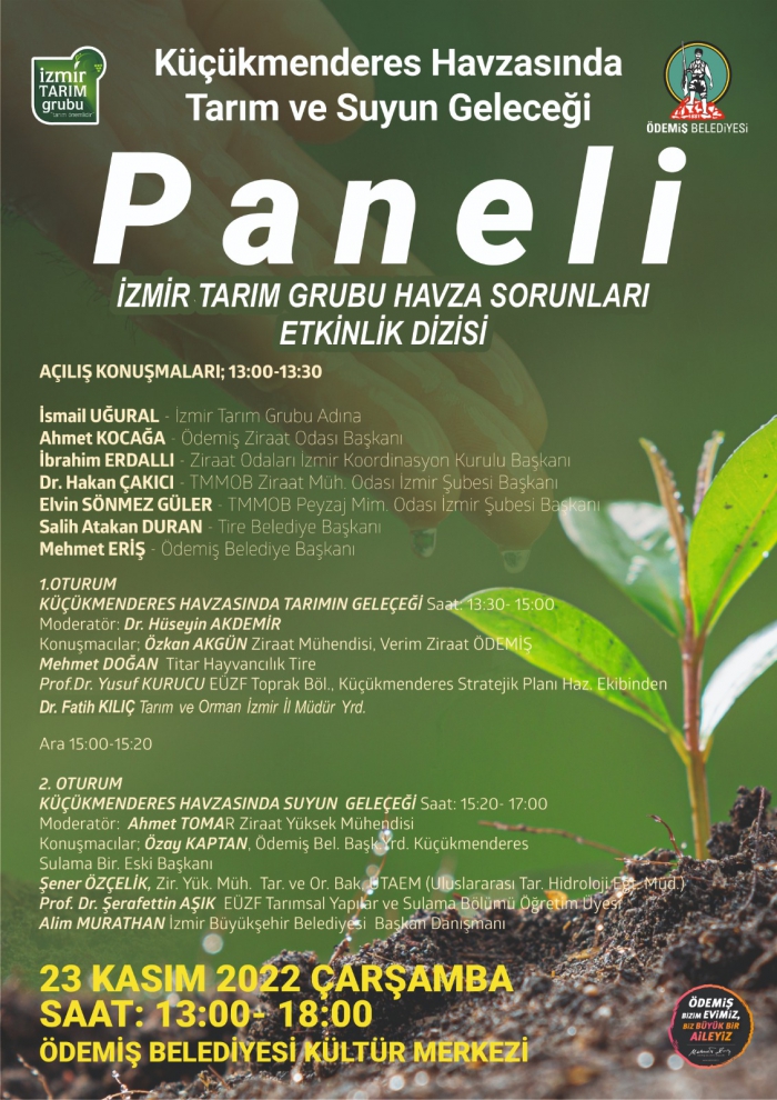 İzmir Tarım Grubu’nun havza sorunları etkinlik dizisinde bu kez Küçük Menderes havzasının sorunlarına Ödemiş Belediyesi ve İzmir Tarım Grubu işbirliğiyle ışık tutulacak. Ödemiş Belediyesi’nin ev sahipliğinde 23 Kasım 2022 Çarşamba günü “Küçük Menderes Havzasında Tarım ve Suyun Geleceği” paneli yapılacak. Ödemiş Belediye Kültür Merkezi’nde 13.00’de başlayacak panelin açılış konuşmalarını İzmir Tarım Grubu adına gazeteci-yazar İsmail Uğural, Ödemiş Ziraat Odası Başkanı Ahmet Kocaağa, Ziraat Odaları İzmir Koordinasyon Kurulu Başkanı İbrahim Erdallı, TMMOB Ziraat Mühendisleri Odası İzmir Şube Başkanı Dr. Hakan Çakıcı, TMMOB Peyzaj Mimarları Odası İzmir Şube Başkanı Elvin Sönmez Güler, Tire Belediye Başkanı Salih Atakan Duran ve Ödemiş Belediye Başkanı Mehmet Eriş yapacak.