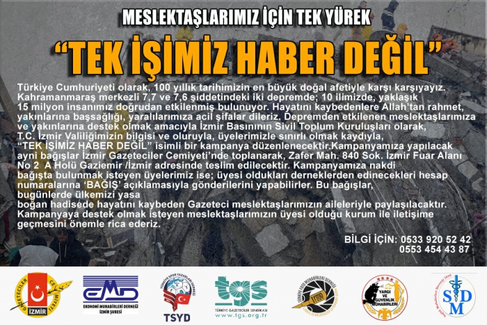 İzmir Gazeteciler Cemiyeti ve İzmir Basınının Sivil Toplum Kuruluşları, depremden etkilenen gazetecilere ve yakınlarına destek olmak amacıyla bağış kampanyası düzenledi. İzmir Gazeteciler Cemiyeti, Ekonomi Muhabirleri Derneği İzmir Şubesi, Türkiye Gazeteciler Sendikası İzmir Şubesi, Türkiye Spor Yazarları Derneği İzmir Şubesi, Türkiye Foto Muhabirleri Derneği Ege Bölge Temsilciliği, Ege Magazin Gazetecileri Derneği, Sağlık Muhabirleri Derneği Ege Bölge Temsilciliği ve İzmir Yargı ve Güvenlik Muhabirleri Derneği, “TEK İŞİMİZ HABER DEĞİL” isimli kampanyada güçlerini birleştirdi.