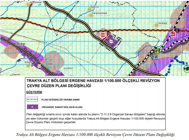 14.06.2014 tarih ve 29030 sayılı Resmi Gazete’de yayımlanarak yürürlüğe giren Mekânsal Planlar Yapım Yönetmeliği ile Trakya Alt Bölgesi Ergene Havzası1/100.000 ölçekli Revizyon ÇDP, Tekirdağ İli 1/25.000 ölçekli ÇDP ile ilgi (a) ve (b) yazılar ile iletilen bilgi/belgeler doğrultusunda yapılan değerlendirmeler neticesinde; 1/100.000 ölçekli Revizyon ÇDP-Plan Hükümlerinin "2.11.3.8. Organize Sanayi Bölgeleri (OSB)" başlığı altında yer alan