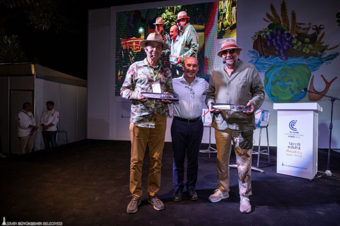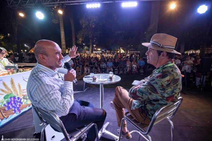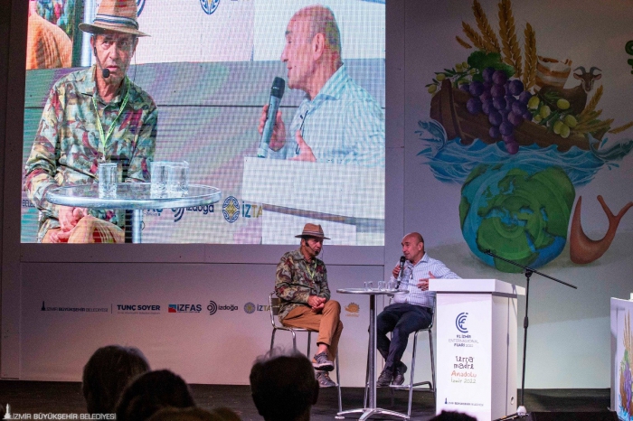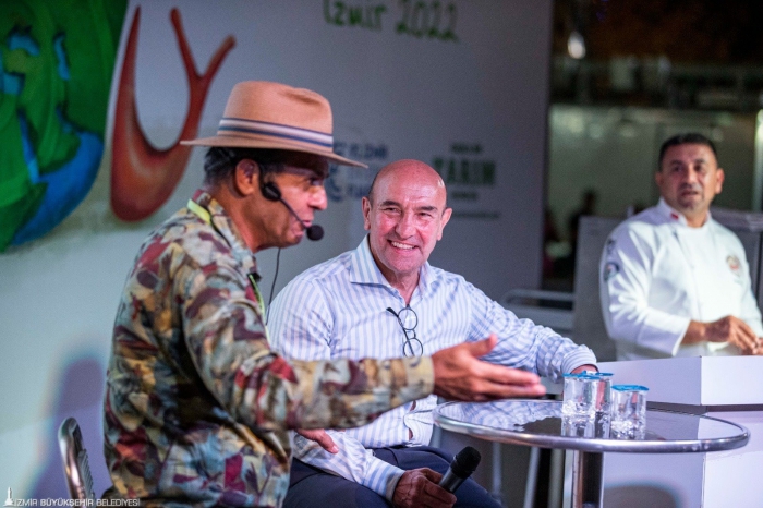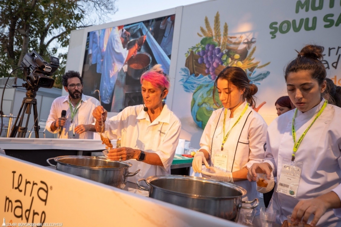 Daha sonra sahne alan Ayhan Sicimoğlu ve şef Ahmet Güzelyağdöken'i de ağırladı. İkiliye Başkan Soyer de eşlik ederek Terra Madre Anadolu hakkında bilgi verdi. Bu sahnede ise zeytin aşı yemeği yapılarak, katılımcılara tadım için dağıtıldı.