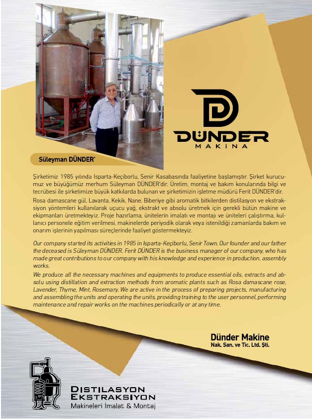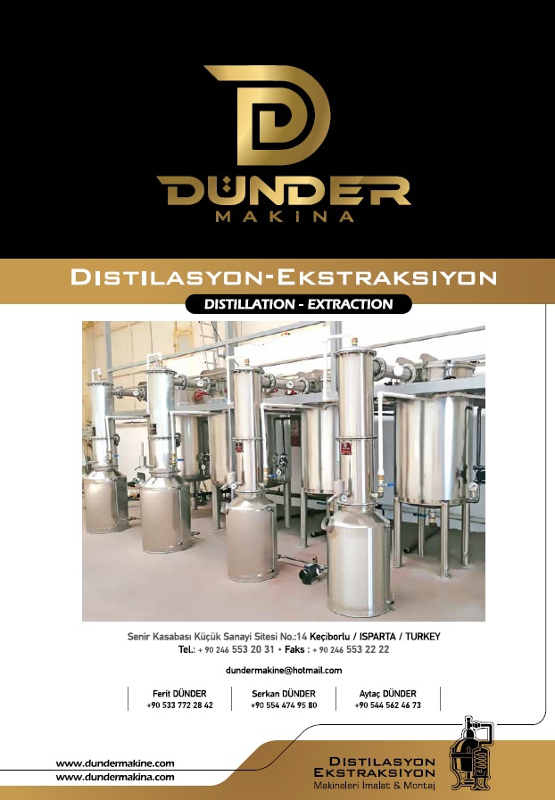 Tıbbı aromatik bitki yetiştiricilerinin tercihi Dünder Makine oldu. Isparta ilinin Keçiborlu ilçesinde 1980 yılından beri distilasyon ve ekstraksiyon makinaları üretimi yapan Dünder Makina Türkiye'ni her yerindeki müşterilerine uygun fiyat ve kaliteden ödün vermeden hizmet vermeye devam ediyor. Türkiye genelindeki resmi kurum ve özel işletmelere distilasyon ve ekstarksiyon makina üretimi yapan firma, aynı zamanda iyi bir çözüm ortaklığı sunuyor.