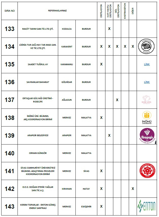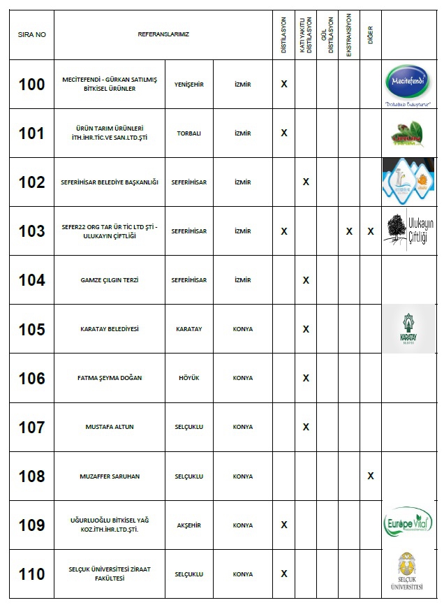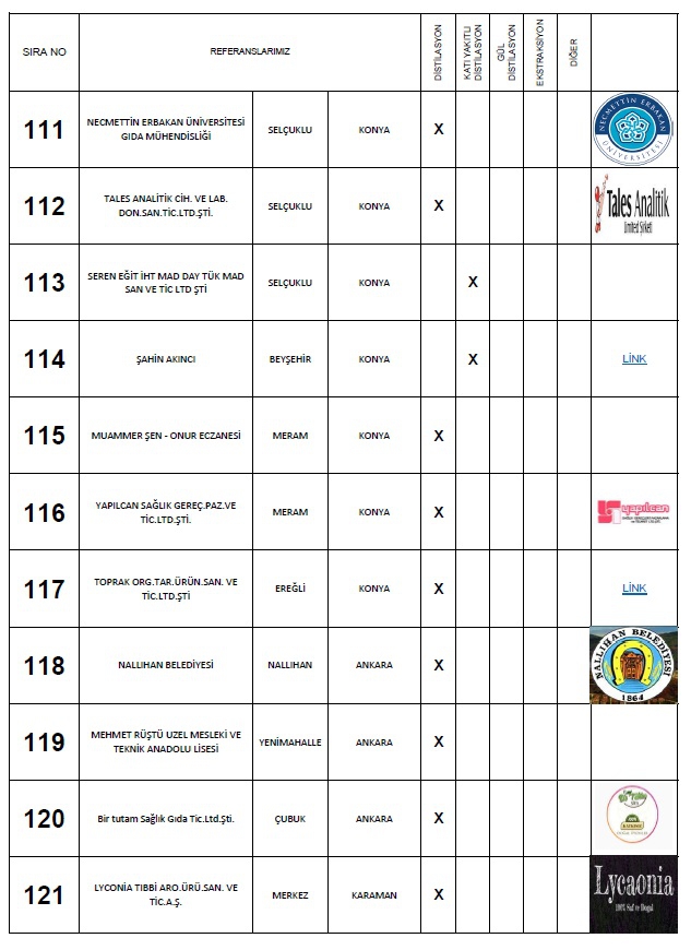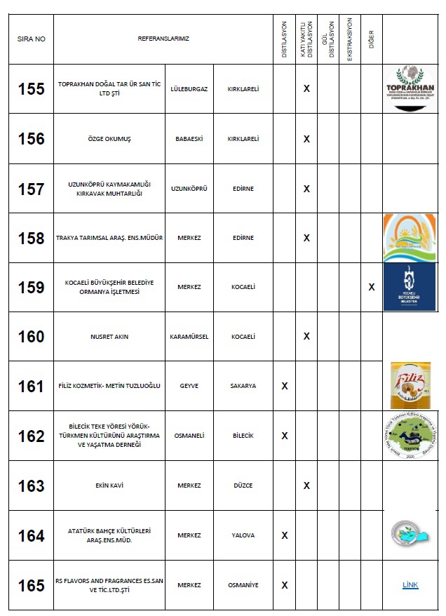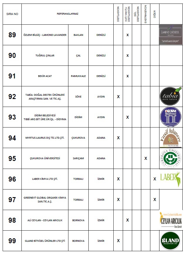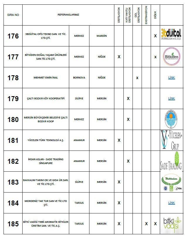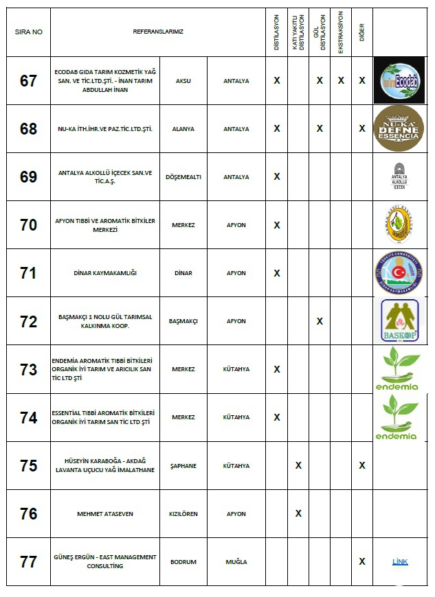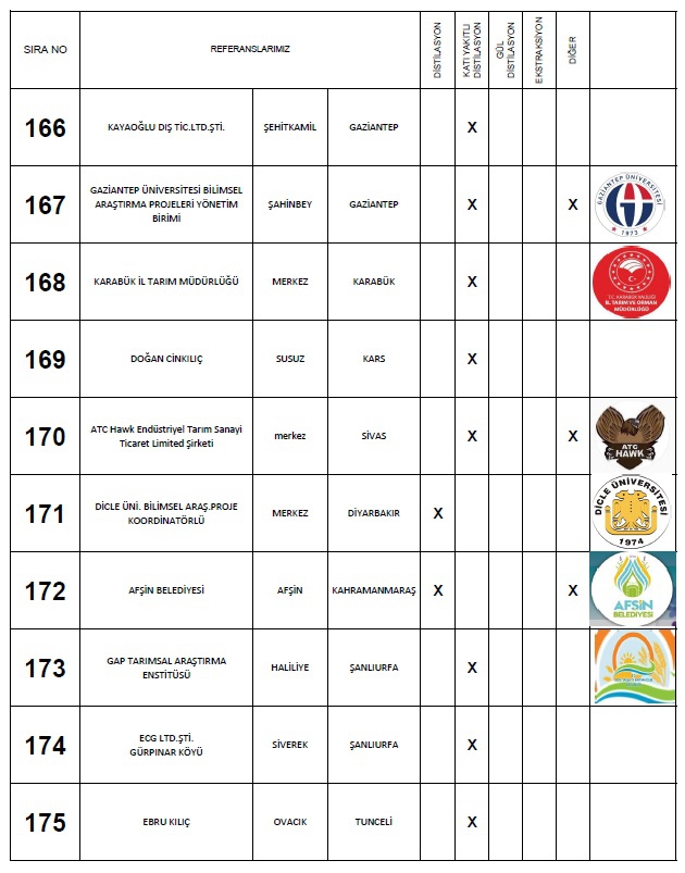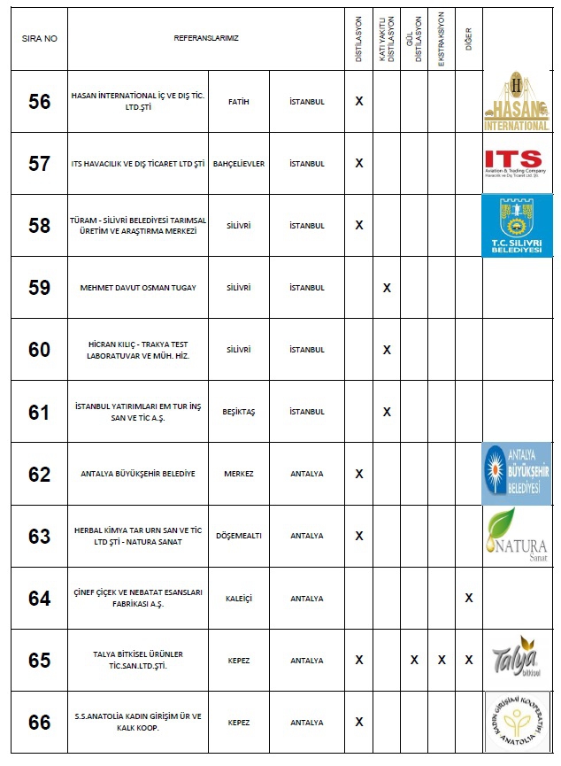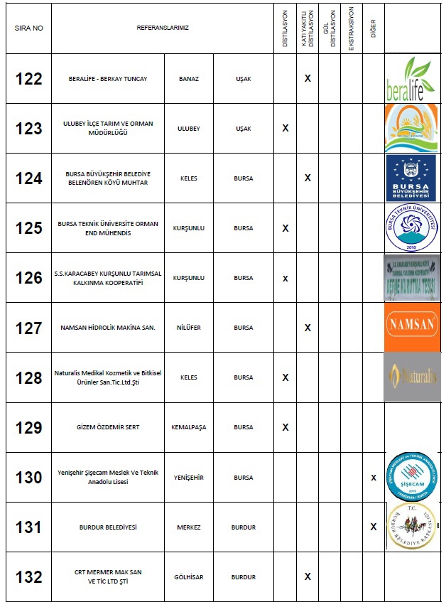 Yaptığımız: Anahtar teslimi distilasyon ve ekstraksiyon tesisi, araştırma ve geliştirme üniteleri ile bu makinaların ekipmanları için; Proje hazırlama, imalat yapmak, montaj ve devreye alma, makinaları kullanacak personelin eğitim verilmesi, makinalarda periyodik olarak istenildiği zamanlarda bakım işlerinin yapılması ve makinaların arızalanması durumlarında onarım işinin yapılması süreçlerinde faaliyet göstermekteyiz.