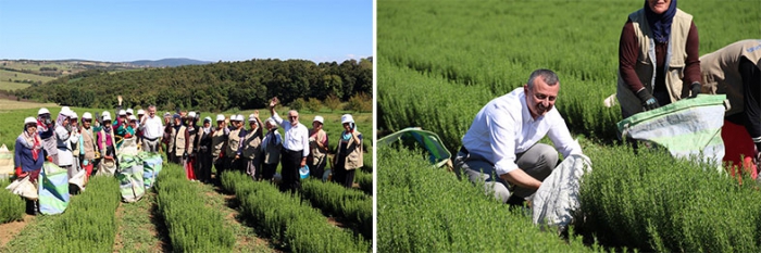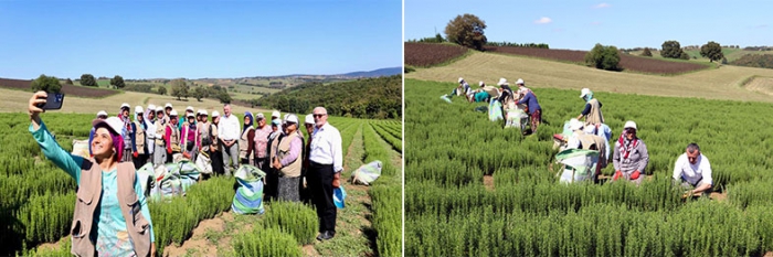 Kadın çiftçilerle birlikte biberiye hasadı yapan Kocaeli Büyükşehir Belediye Başkanı Doç. Dr. Tahir Büyükakın, daha sonra tasarımı ve üretimi tamamen milli ve yerli imkanlarla yaptırılan römork yüklemeli aromatik bitki hasat makinasını kullanarak hasada devam etti. Hasadın hayırlı ve bereketli olması temennisinde bulunan Büyükakın, bakımını özenle yaptığı tarlada kaliteli ve verimli biberiye yetiştiren Beyhan Şen’i tebrik etti. Projede görev yapan teknik ekip ve kadın çiftçilere çalışmalarından ötürü teşekkür eden Başkan Büyükakın, daha sonra çiftçilerle fotoğraf çekildi.