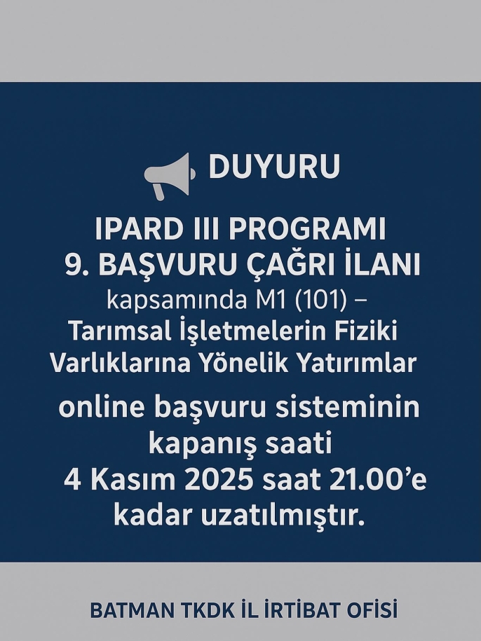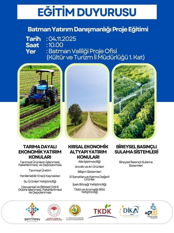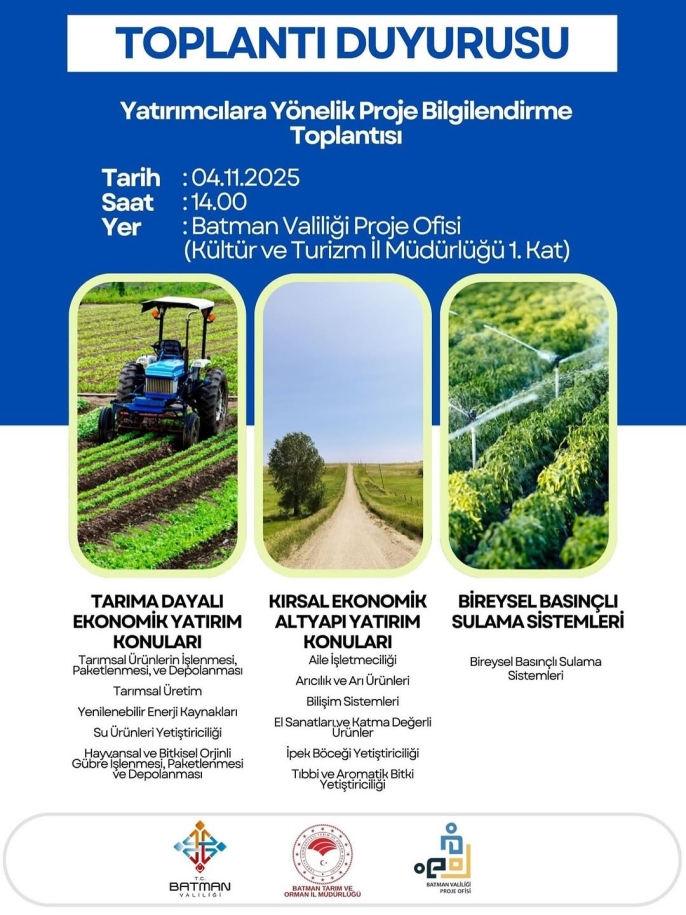 Batman, tarım ve kırsal kalkınma alanında bölgesel potansiyeli harekete geçirecek önemli bir etkinliğe ev sahipliği yapmaya hazırlanıyor. Vali Ekrem Canalp’in öncülüğünde ve Batman Valiliği Proje Ofisi'nin koordinasyonunda, 4 Kasım Salı günü kapsamlı bir eğitim ve bilgilendirme toplantısı düzenlenecek.