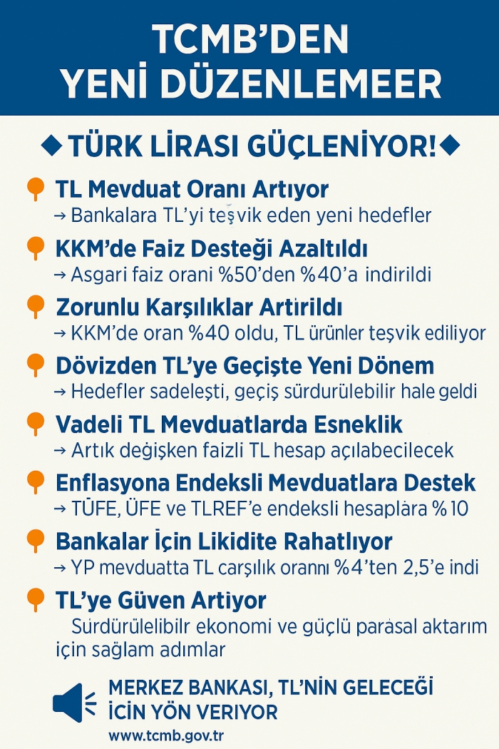 TCMB, TL’ye geçişi hızlandırmak için KKM faiz oranını düşürdü, zorunlu karşılıkları artırdı. Yeni makroihtiyati kararlar finans sistemini etkileyecek.