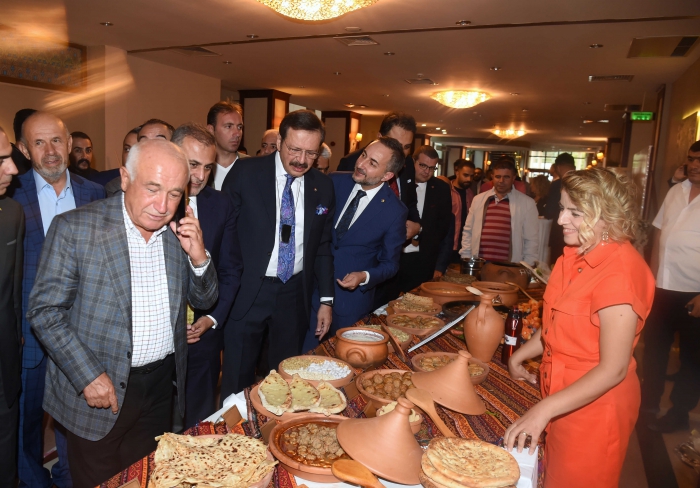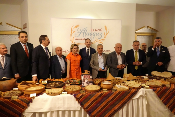 Program kapsamında Elazığ TSO tarafından Türk Patent ve Marka Kurumuna tescili yaptırılan Elazığ Ataoğuz Yemekleriyle ilgili Akgün Otelde açılan stant TOBB Başkanı Hisarcıklıoğul ve tüm davetliler tarafından ziyaret edildi. Yemekleri sunumunu gerçekleştiren Elazığ Gastronomi Derneği Başkanı Harun Seyran ile Elazığ Mutfak 23 Yemek Kitabının Yazarı Mehtap Öze Seyran tarafından Elazığ’ın geleneksel yemekleri hakkında bilgiler verildi. Elazığ TSO Yönetim Kurulu Başkanı Asilhan Arslan’da Elazığ TSO öncülüğünde, Fırat Üniversitesi, İl Tarım ve Orman Müdürlüğü, Elazığ Gastronomi Derneği ve diğer paydaşlarla işbirliği halinde Elazığ Ataoğuz Yemekleri çatısı altında bulunan geleneksel yemeklerin bir çoğunun Coğrafi Tescil Sürecinin başlatıldığını söyledi. Başkan Arslan, Ankara Ticaret Odası tarafından yapılan araştırmada Ülkemizin en zengin ikinci mutfağına sahip olan Elazığ’ın bu değerinin turizm potansiyeli olarak ekonominin önemli bir parçası haline getirmeyi hedeflediklerini ifade etti. Sergilenen her bir yemeği tadan ve bilgi alan 25. Dönem TBMM Başkanı Cemil Çiçek ve TOBB Başkanı M.Rifat Hisarcıklıoğulu Elazığ’ın bu zengin yönünün bilindiğini ama turizm potansiyeline dönüştürülme sürecinin çok değerli olduğunun altını çizdiler.