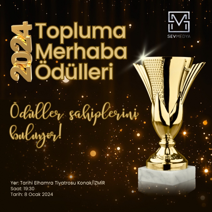 SevMedya Yayın Grubu'nun geleneksel olarak her yıl verdiği "Topluma Merhaba Ödülleri" 8 Ocak 2024 Pazartesi akşamı sahiplerini buluyor. İzmir Büyükşehir Belediyesi Şehir Tiyatroları Elhamra Sahnesi'nde gerçekleşecek törende, toplumun farklı alanlarda katkı sağlayan kişi ve kurumlarını ödüllendirmek amacıyla 7 dalda (siyaset, ekonomi, kültür/sanat, spor, medya, müzik, sivil toplum) halk oyuyla belirlenen ödüller takdim edilecek.