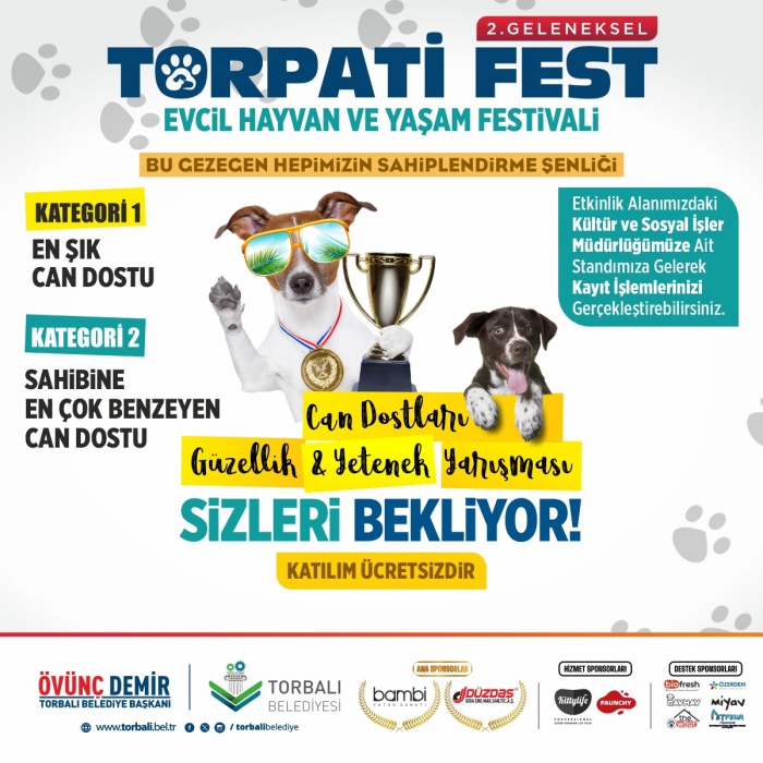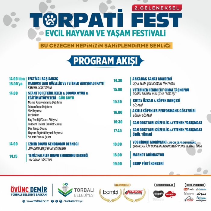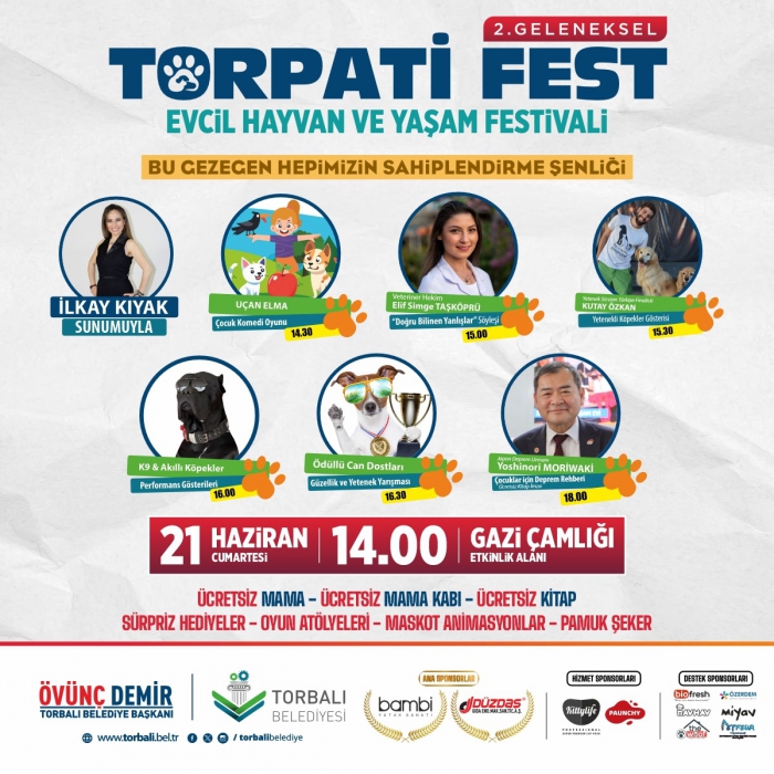 Festival, 15 Haziran Cumartesi günü saat 14.00’ten itibaren Torbalı Belediyesi Kültür Merkezi açık alanında başlayacak. Birbirinden renkli gösteriler, eğlenceli atölyeler, sosyal farkındalık çalışmaları ve sahiplendirme faaliyetlerinin yer alacağı festival, gün sonunda Pinti Müzik Grubu’nun sahne performansıyla taçlanacak.