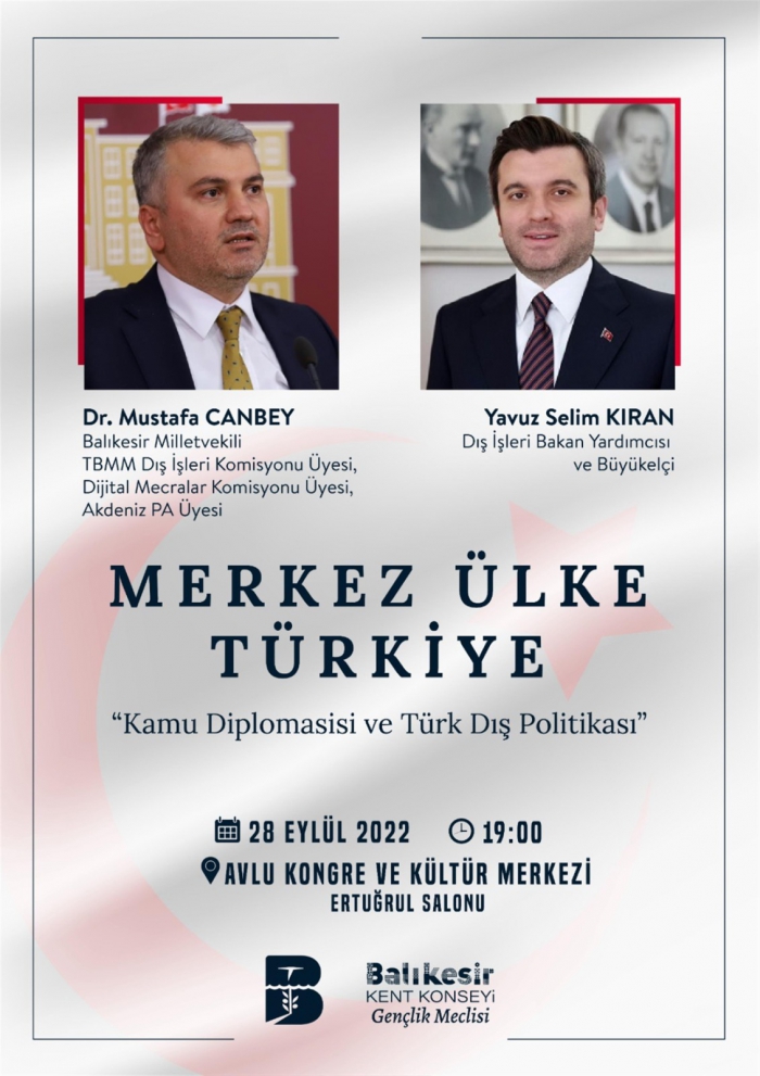 AK Parti Balıkesir Milletvekili Dr. Mustafa Canbey ile Dış İşleri Bakan Yardımcısı Büyükelçi Yavuz Selim Kıran “Merkez Ülke Türkiye” konulu söyleşide, 28 Eylül Çarşamba günü Avlu Kongre Merkezi’nde gençlerle buluşuyor. Programda; kamu diplomasisi ve Türk dış politikası detaylı olarak ele alınacak.