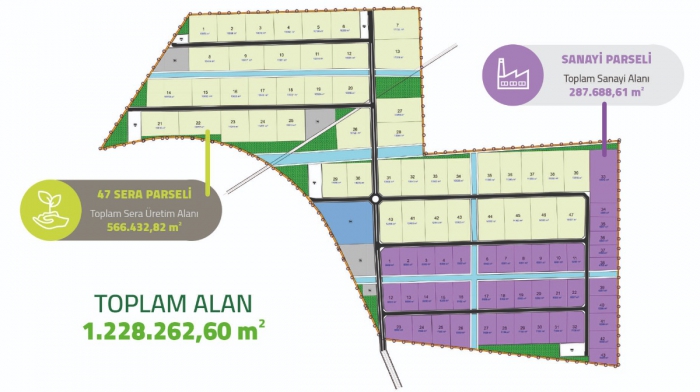 SANAYİ PARSELİ Toplam Sanayi Alanı 287.688,61 m² 47 SERA PARSELİ Toplam Sera Üretim Alanı 566.432,82 m² TOPLAM ALAN 1.228.262,60 m² SERA ADALARI Sera parsellerinin oluşturulacağı Alanlar (En Az 10 Dekarlık Sera Parseli). 5 dekar kapalı üretim 5 dekar da açık olarak kullanılabilecektir. SANAYİ ADALARI İhtisas konusuna uygun sanayi parselleri. EĞİTİM VE ARAŞTIRMA ALANI İhtisas konusuna uygun Lise / Üniversite / Araştırma merkezi alanı.