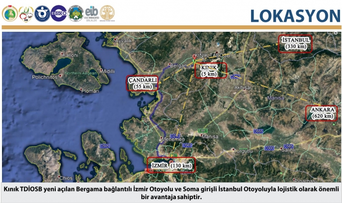 Kınık TDİOSB toplam alanı 1.228.262,60 m²’dir. D240 Bergama – Soma karayolu üzerinde bulunan Kınık TDİOSB, İzmir il merkezine 130 km, Bergama ilçe merkezine 23 km ve Kınık ilçe merkezine 7 km uzaklıktadır.
