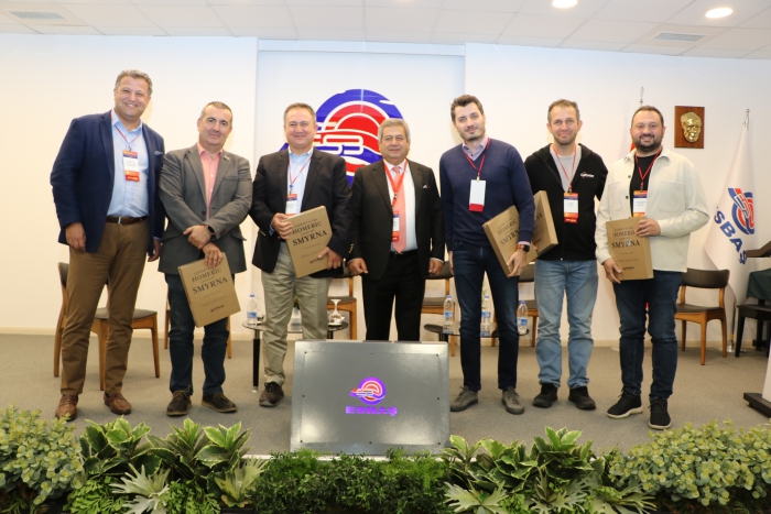 FOTOĞRAF ALTI: YABİSAK Başkanı Dr. Faruk Güler, Endeavor Türkiye Yönetim Kurulu Üyesi Koray Gültekin Bahar’a ve panelistlere Homeriç Landscape Smyrna kitabını hediye etti.