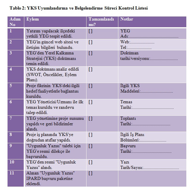 İlk olarak, yatırımın planlandığı coğrafi alanda faaliyet gösteren yetkili Yerel Eylem Grubu'nun tespit edilmesi gerekir. Tarım ve Orman Bakanlığı'nın IPARD web sitesi , TKDK İl Koordinatörlükleri ve yerel yönetimler bu konuda birincil bilgi kaynaklarıdır. YEG tespit edildikten sonra, o YEG'in yol haritası olan Yerel Kalkınma Stratejisi (YKS) dokümanına ulaşılmalıdır. Bu belge genellikle YEG'lerin kendi web sitelerinde yayınlanır.