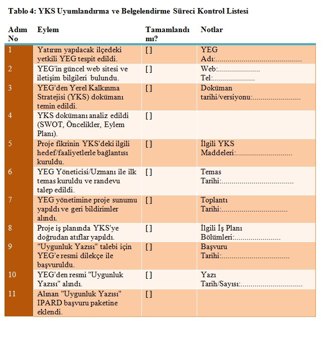 Dördüncü adım, bu uyumun IPARD başvuru paketine etkili bir şekilde yansıtılmasıdır. İş planınızın "Projenin Gerekçesi" ve "Amaç ve Hedefler" gibi bölümlerinde, YKS'ye doğrudan atıfta bulunarak projenizin bu stratejiye nasıl somut bir cevap ürettiğini açıkça yazmalısınız.