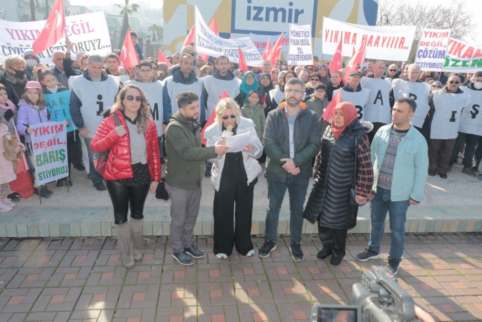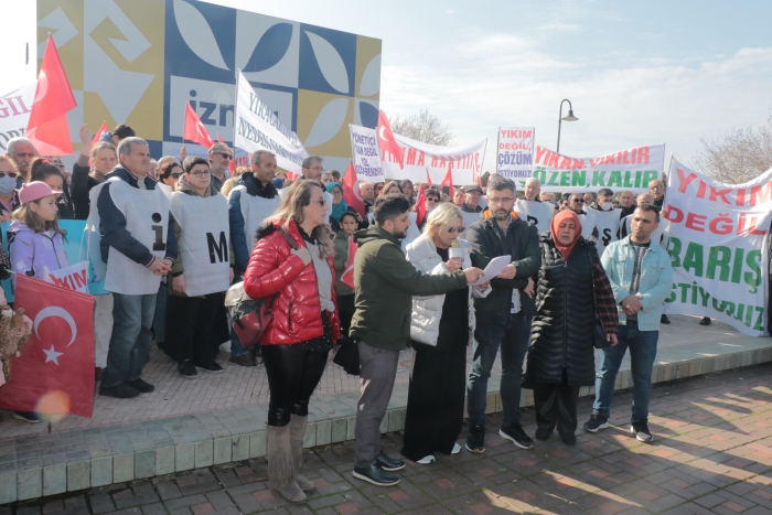 Konak Meydanı’nda toplanarak hazırladıkları basın açıklamasını okuyan İmar Barışı Mağdurları Platformu Basın Sözcüsü Sevda Akyürek, bugün imar barışı mağdurları olarak toplanma sebeplerinin, Çevre ve Şehircilik Bakanlığı tarafından 2018 yılında çıkarılan İmar Barışı yasasının uygulanmasından sonra çektikleri sıkıntıları yetkili ve etkili kişilere duyurmak olduğunu söyledi.
