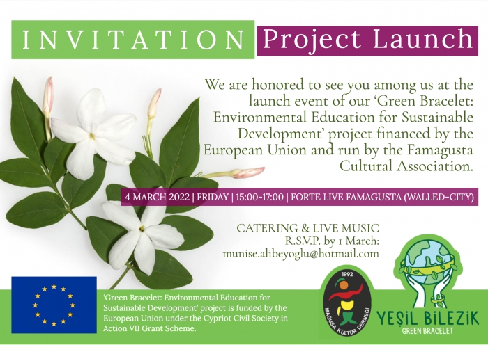 Avrupa Birliği tarafından finanse edilen ve Mağusa Kültür Derneği tarafından yürütülmekte olan “Yeşil Bilezik: Sürdürülebilir Kalkınma için Çevre Okur-Yazarlığı Projesi” 4 Mart Cuma günü saat 15:00’te Forte Live Mağusa’da gerçekleşecek olan lansman etkinliği ile halka ve basına tanıtılacak.