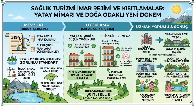 Uzman Yorumu: Yeni imar rejimi dikey betonlaşmayı sınırlandırarak yatay mimariyi teşvik etmektedir. Bu yaklaşım, ilk yatırım maliyetlerini artırsa da, tesisleri soğuk bir hastane havasından çıkarıp hastaların doğayla iç içe iyileştiği "şifa merkezlerine" dönüştürerek, premium fiyatlama yapılabilmesine olanak tanıyacaktır.