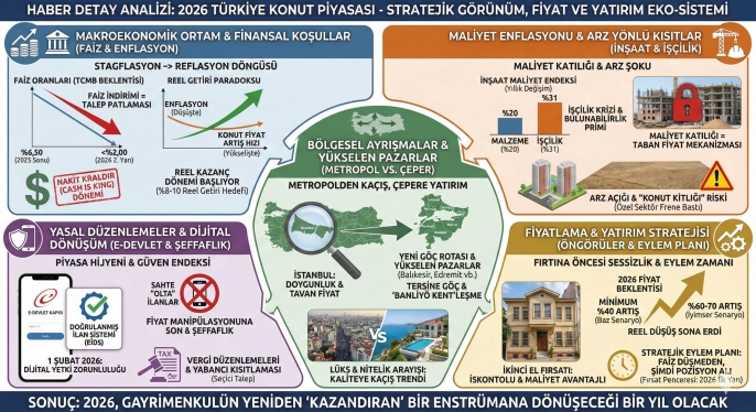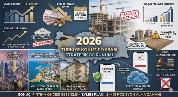 Türkiye gayrimenkul sektörü, on yıllardır süregelen yüksek enflasyonist ortamda hane halkı ve yatırımcılar için birincil servet saklama aracı olma işlevini sürdürmüştür. Ancak 2024 ve 2025 yılları, bu geleneksel kabulün ciddi bir sınavdan geçtiği, reel fiyatların gerilediği ve piyasa dinamiklerinin kökten değiştiği bir "düzeltme ve arınma" dönemi olarak kayıtlara geçmiştir. 2026 yılına girerken, piyasa katılımcıları; birikmiş talep baskısı, değişen faiz politikaları, arz yönlü kısıtlar ve dijitalleşen yasal altyapı (E-Devlet entegrasyonu) gibi çok bilinmeyenli bir denklemle karşı karşıyadır. Bu rapor, 2026 yılı konut fiyatlarının seyrini, yalnızca yüzeysel fiyat hareketleri üzerinden değil; makroekonomik temeller, maliyet endeksleri, sosyolojik demografik değişimler ve mikro bölgesel ayrışmalar ekseninde, derinlemesine ve çok katmanlı bir bakış açısıyla analiz etmeyi amaçlamaktadır.
