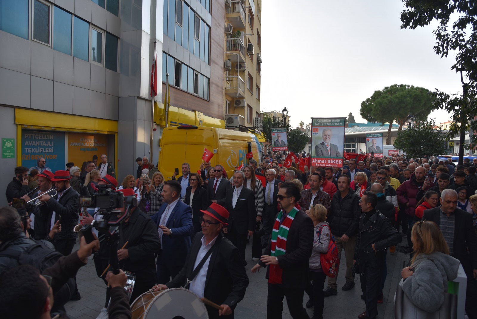 Ahmet Diker’in adaylık açıklaması bir mitinge dönüştü. Karşıyaka İZBAN istasyonunda bir araya gelen yüzlerce Ahmet Diker taraftarları ellerinde taşıdıkları Atatürk posteri, Türk Bayrağı ve Diker’in posterleri Kaf Kaf,Kaf Sin Kaf sloganları ile CHPKarşıyaka İlçe Örgütü'ne kadar yürüdü.